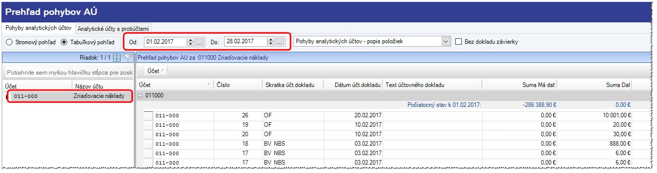 Po stlačení voľby na odskok do okna Prehľad pohybov AU, systém odskočí do okna, kde je vyfiltrovaný daný analytický účet za dané obdobie.
