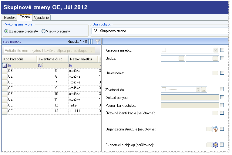 V tejto záložke si označíte majetky v ktorých chcete uskutočniť želanú zmenu a kliknete na záložku.