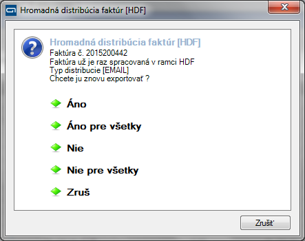 • Po potvrdení „OK“ v dialógovom okne program spracuje všetky označené (selektované) FV alebo ZFV. Podľa nastavenia MU „EL_DOKLAD“ sa rozhodne, či bude doklad smerovaný na zvolenú tlačiareň, alebo bude odoslaný e-mail na všetky adresy definované v spojeniach daného odberateľa (viď. vyššie).