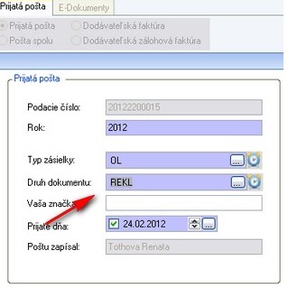 Pri nahrávaní prijatej poštovej zásielky, je potrebné zvoliť druh dokumentu s príznakom „REKL“ v záložke Druhy dokumentov.